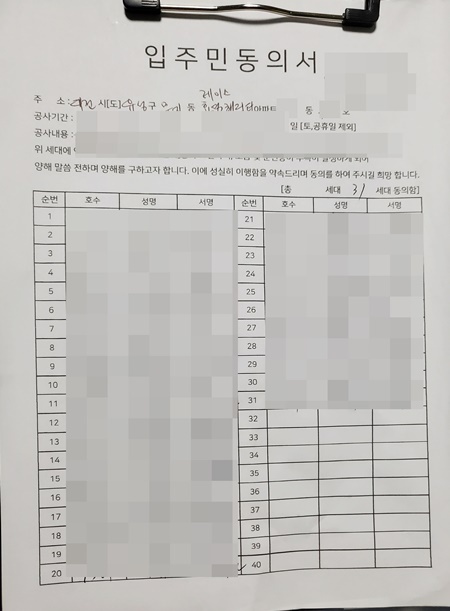 주민들께 인테리어 동의서 서명을 받기 위해