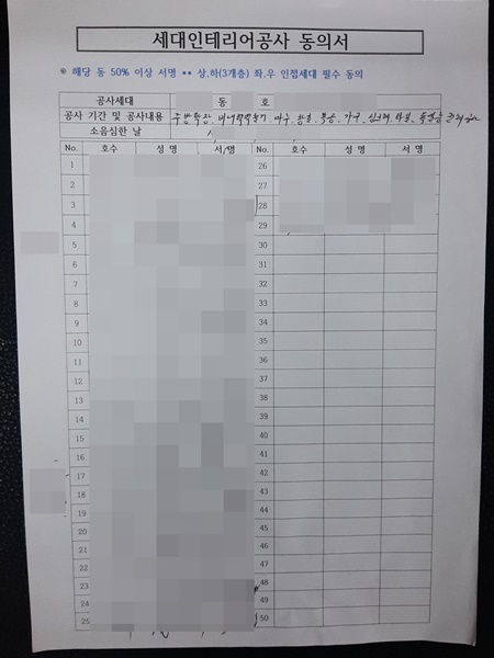 동의 서명에는 각 세대의 호수와 이름, 서명까지