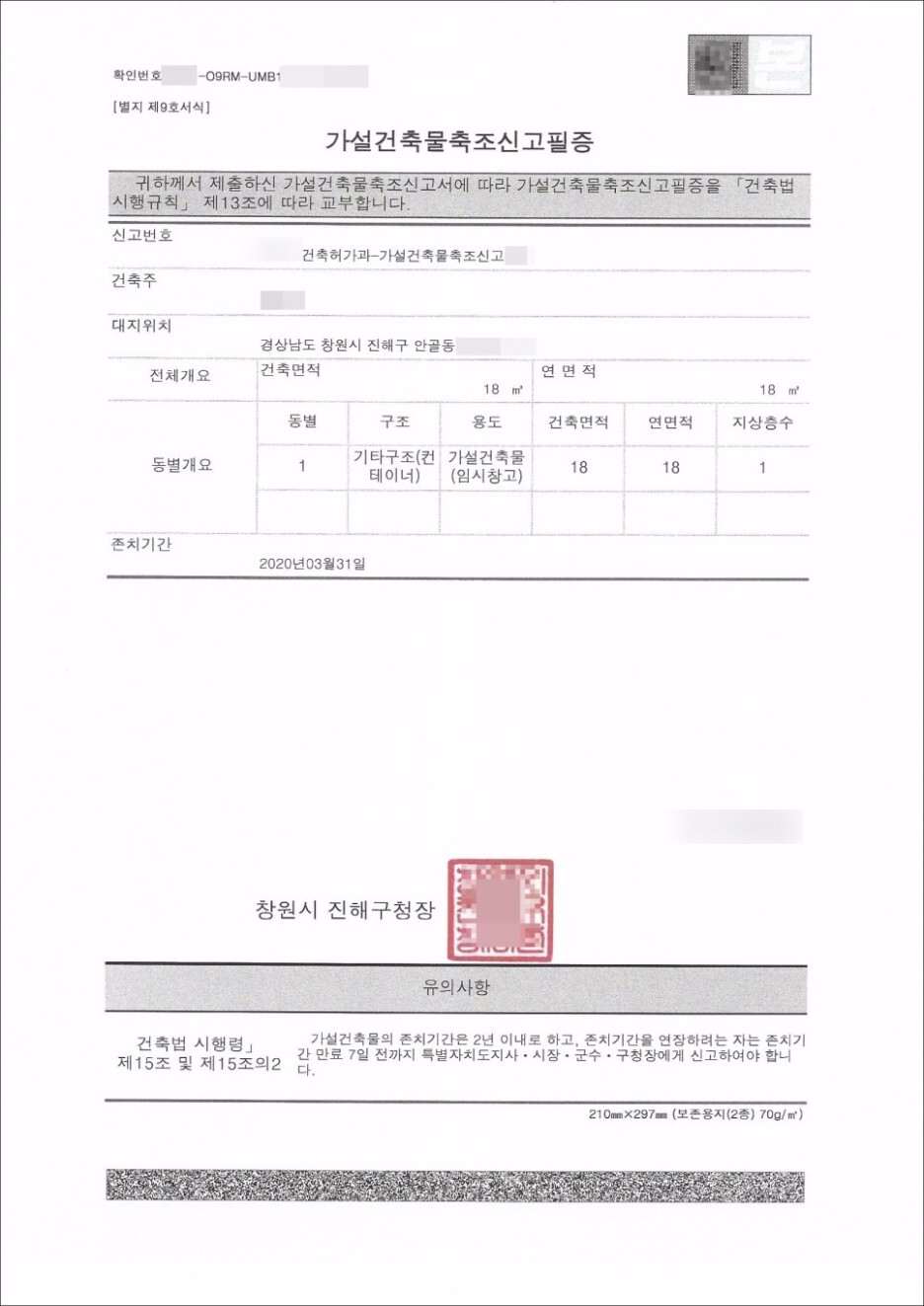 가설 건축물 축조 신고 필증이 발급되었습니다.