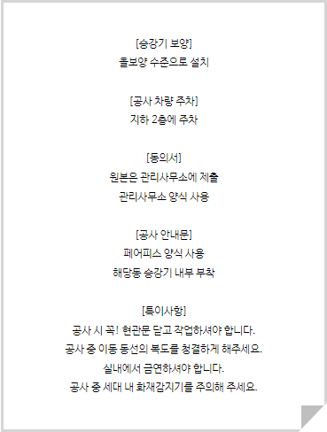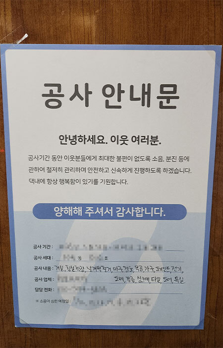 인테리어 공사 안내문을 부착하여