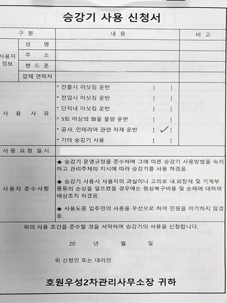 인테리어 동의서, 승강기 보양, 행위허가 등의