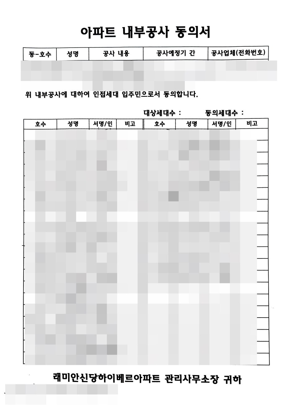 해당 동 입주민분들께 인테리어 공사 동의를 구하기 위해