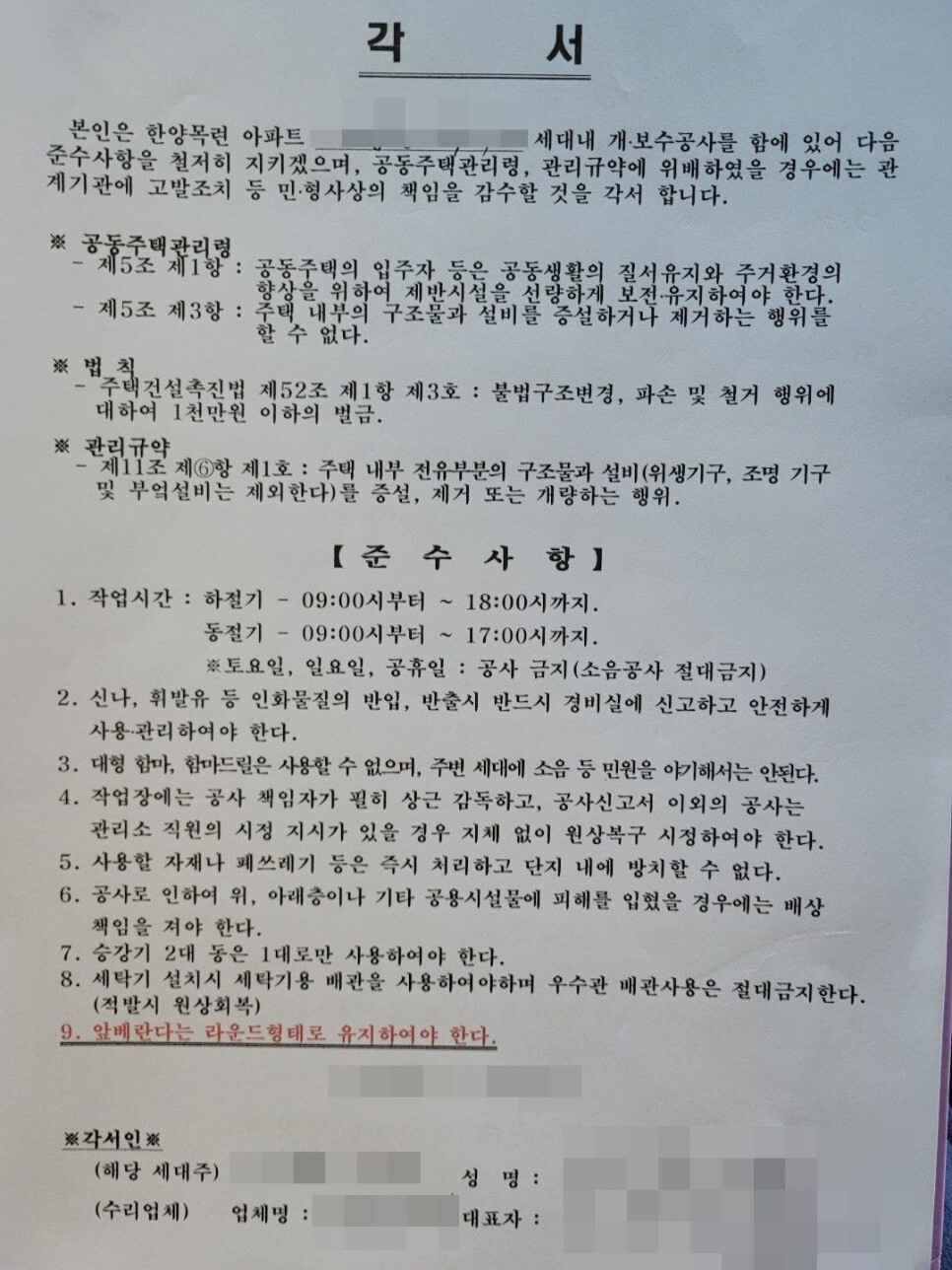 인테리어동의서의 규정에 대한 안내를 받은 후