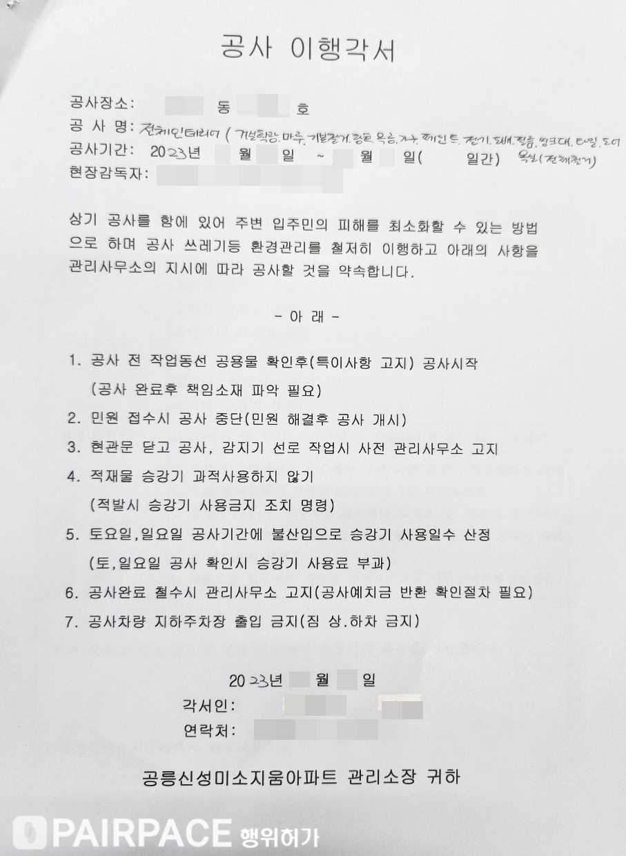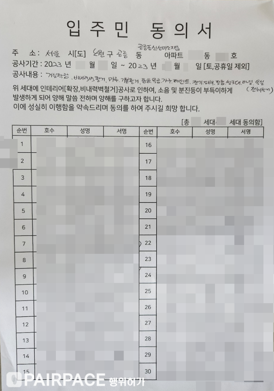 해당 동 입주민분들께 인테리어 공사 동의를