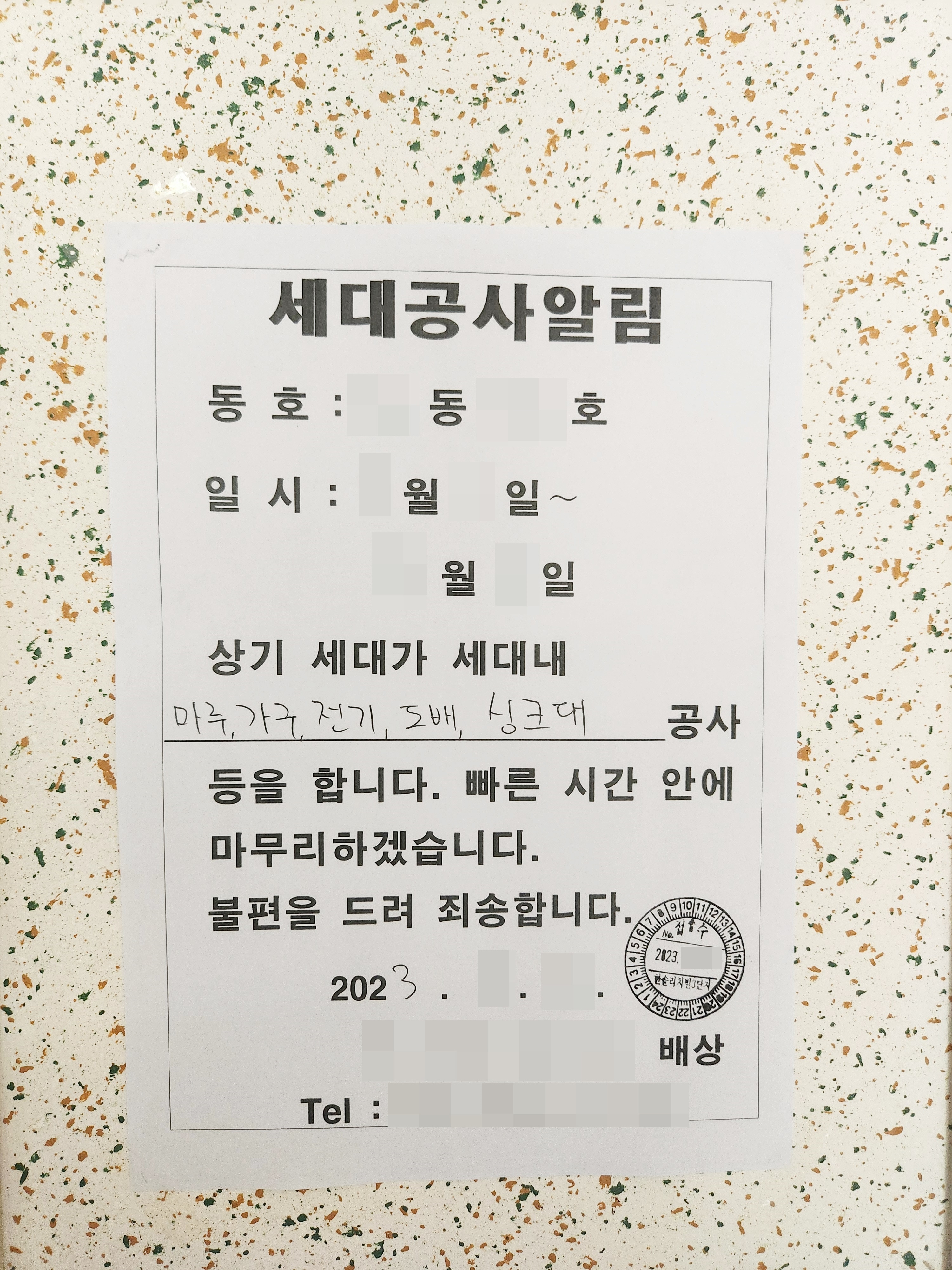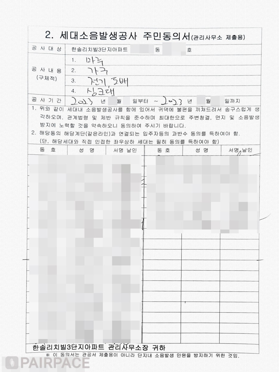해당 동 입주민분들께 인테리어 공사 동의를