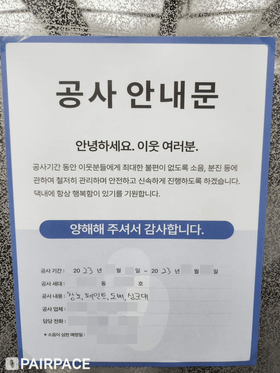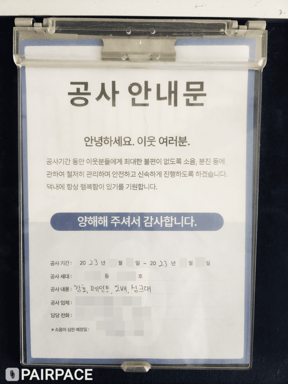 개별적으로 공사기간, 소음 일정, 공사 담당자