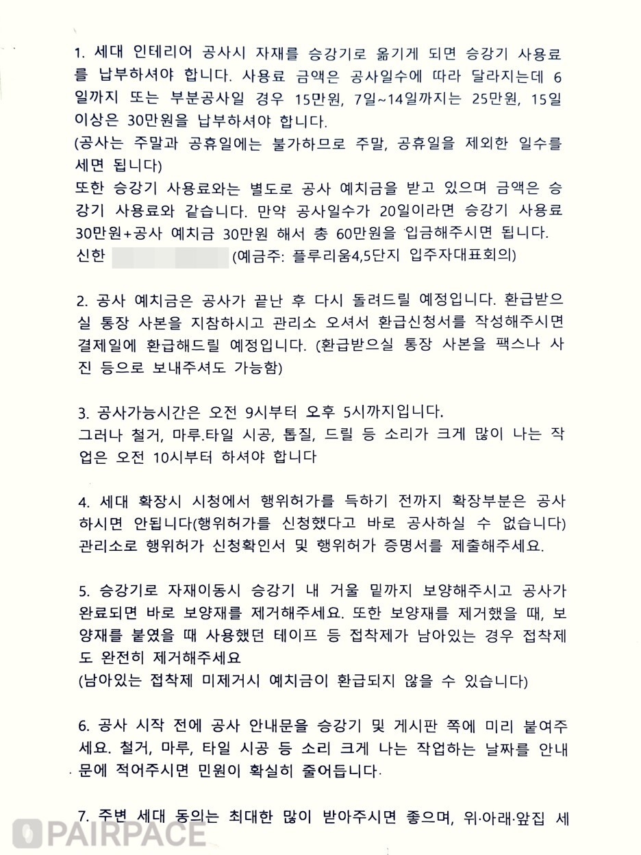개별적으로 공사기간, 소음 일정, 공사 담당자