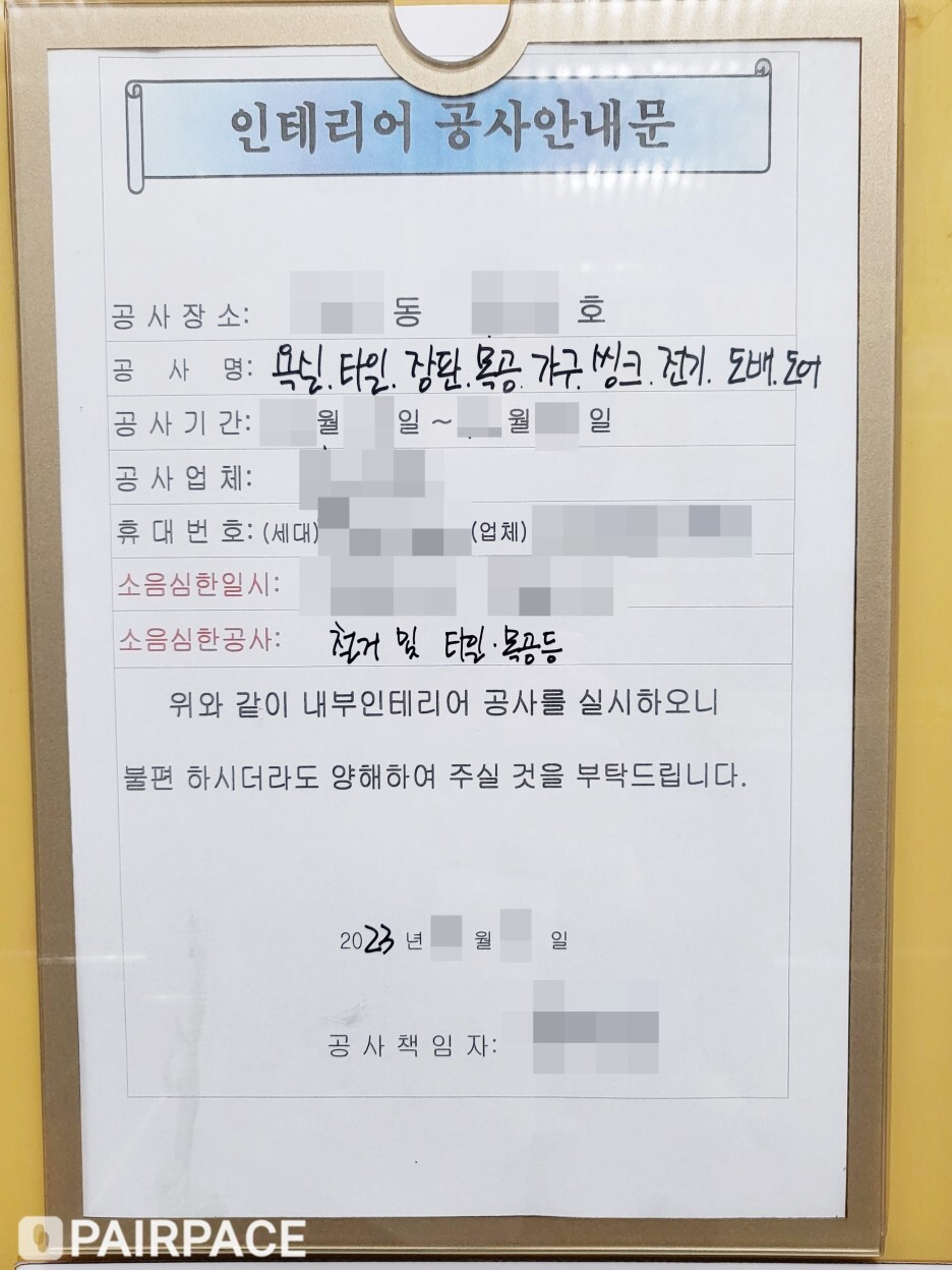개별적으로 공사기간, 소음 일정, 공사 담당자