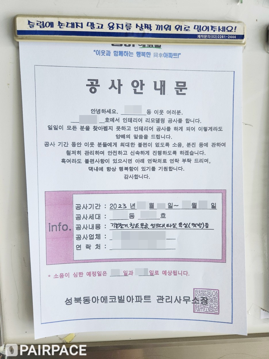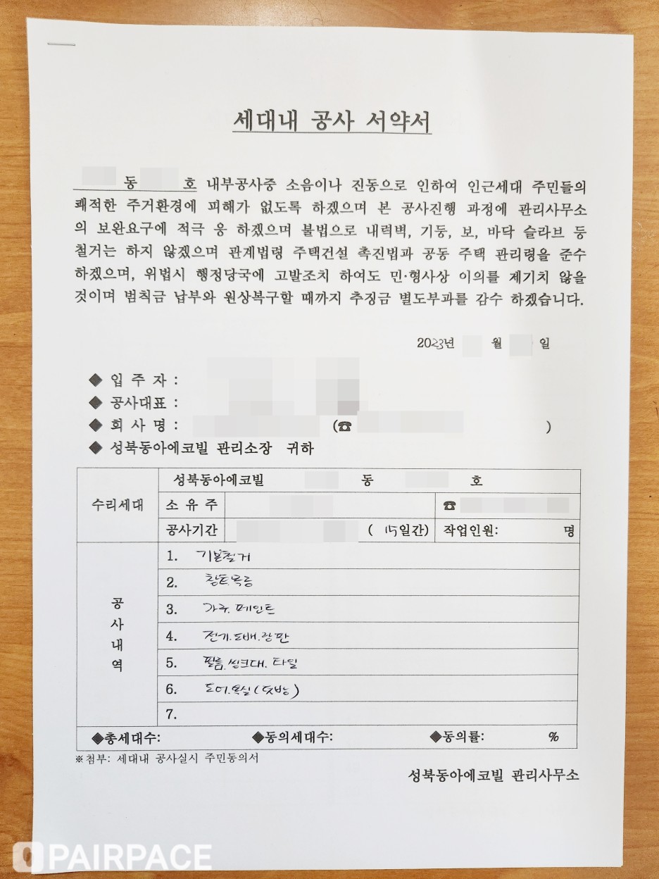 해당 동 입주민분들께 인테리어 공사 동의를