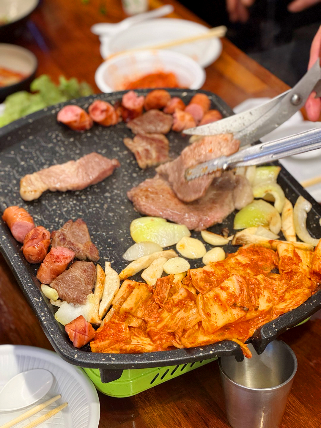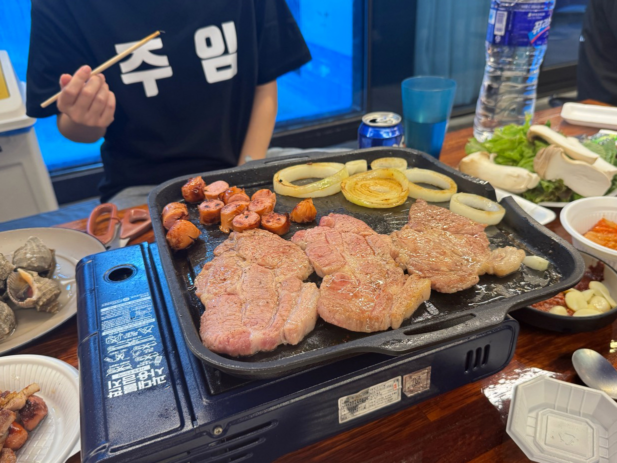 불판 위 고기, 시원한 음료,