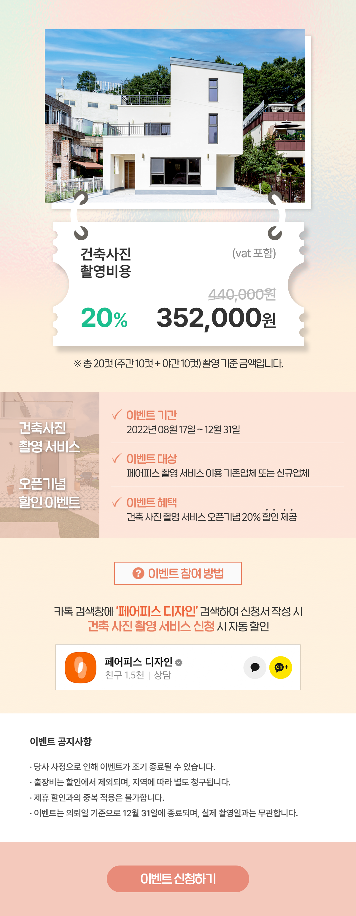 혜택 : 건축 사진 촬영 서비스 오픈 기념 20% 할인 제공